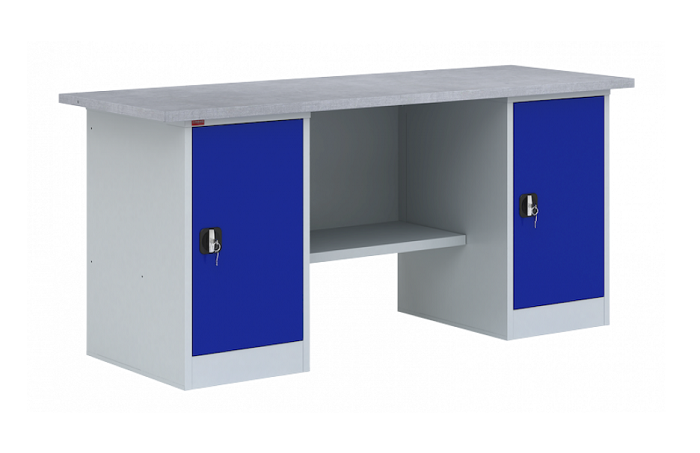 Металлические слесарный верстак ВП-5 представляет собой рабочий стол для ручной обработки металлических, деревянных изделий, а также предметов, выполненных из других материалов. Металлический верстак используется в мастерских, гаражах, автосервисах и в других рабочих зонах. Он являются основой, как небольшого промышленного производства, так и крупного предприятия. Допустимая равномерно распределенная нагрузка на верстак - 1000 кг, на полку верстачную - 40 кг, на полку тумбы Т-1 - 30 кг. В комплект верстака ВП-5 входит: столешница СТ-3 из МДФ, покрытая оцинкованным листовым металлом, стенка задняя металлическая, две тумбы Т-1 с двумя съемными полками. Тумбы закрываются ключевым замком. Дополнительно на верстак можно установить перфорированный экран соответствующего размера, аксессуары на экран. Цвет: верстак - серый Ral 7035, дверь тумбы - синий Ral 5002