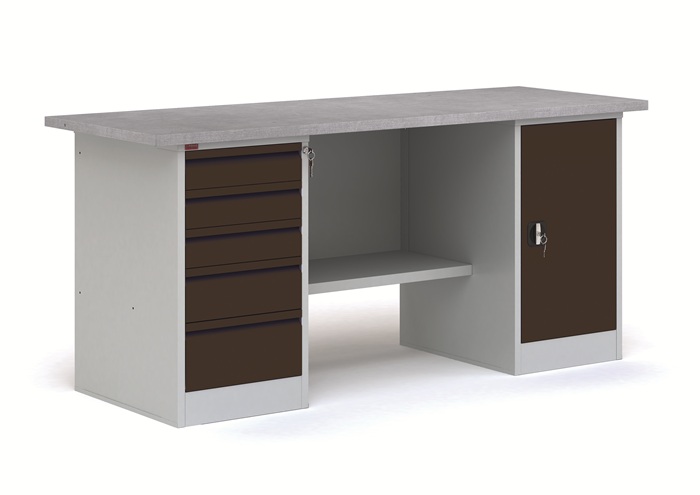Металлические слесарный верстак ВП-4Т/1,9 черный представляет собой рабочий стол для ручной обработки металлических, деревянных изделий, а также предметов, выполненных из других материалов. Металлический верстак используется в мастерских, гаражах, автосервисах и в других рабочих зонах. Он являются основой, как небольшого промышленного производства, так и крупного предприятия. Допустимая равномерно распределенная нагрузка на верстак - 1000 кг, на полку верстачную - 40 кг, на выдвижной ящик и полку тумбы - 30 кг. В комплект верстака ВП-4Т/1,9 черный входит: столешница СТ-1,9 из МДФ, покрытая оцинкованным листовым металлом, комплект К-3/1,9 (стенка задняя металлическая), тумба Т-2Т с пятью выдвижными ящиками на телескопических направляющих, тумба Т-1 с двумя съемными полками. Тумбы закрываются ключевым замком. Дополнительно на верстак можно установить два перфорированных экрана соответствующего размера, аксессуары на экран. Цвет: верстак - серый Ral 7035, дверь тумбы - черный муар Ral 7021. Гарантия 1 год. Срок службы 10 лет