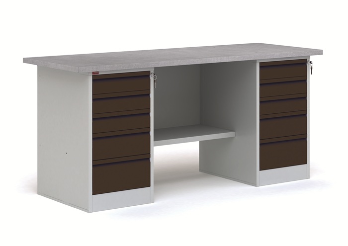 Металлические слесарный верстак ВП-6Т/1,6 черный представляет собой рабочий стол для ручной обработки металлических, деревянных изделий, а также предметов, выполненных из других материалов. Металлический верстак используется в мастерских, гаражах, автосервисах и в других рабочих зонах. Он являются основой, как небольшого промышленного производства, так и крупного предприятия. Допустимая равномерно распределенная нагрузка на верстак - 1000 кг, на полку верстачную - 40 кг, на выдвижной ящик - 30 кг. В комплект верстака ВП-6Т/1,6 черный входит: столешница СТ-1,6 из МДФ, покрытая оцинкованным листовым металлом, комплект К-3/1,6 (стенка задняя металлическая), две тумбы Т-2Т с пятью выдвижными ящиками на телескопических направляющих. Тумбы закрываются центральным ключевым замком. Дополнительно на верстак можно установить перфорированный экран соответствующего размера, аксессуары на экран. Цвет: верстак - серый Ral 7035, лицевая панель ящиков и двери - черный муар Ral 7021. Гарантия 1 год. Срок службы 10 лет